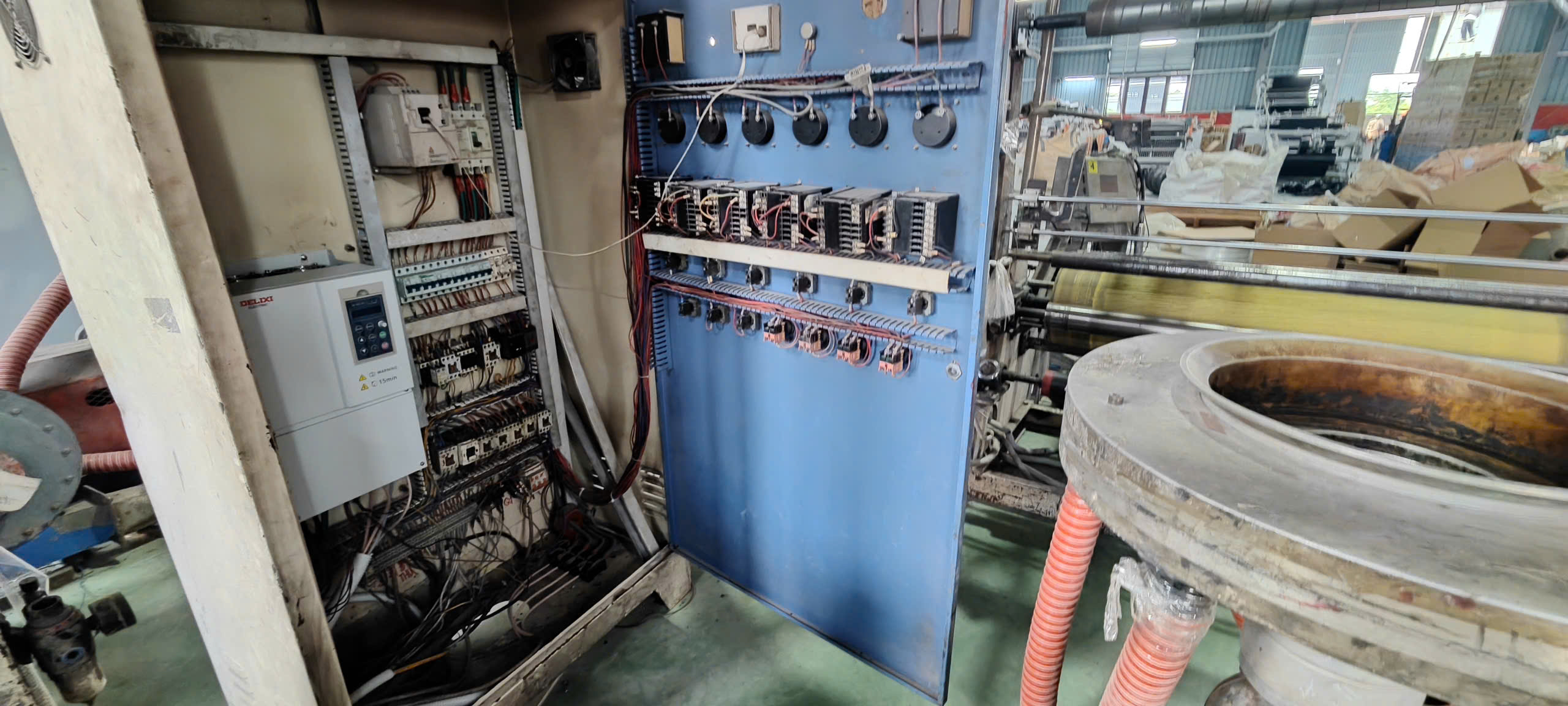 Tủ điện điều khiển bơm thủy lực, trục vít, dao cắt, motor kéo.