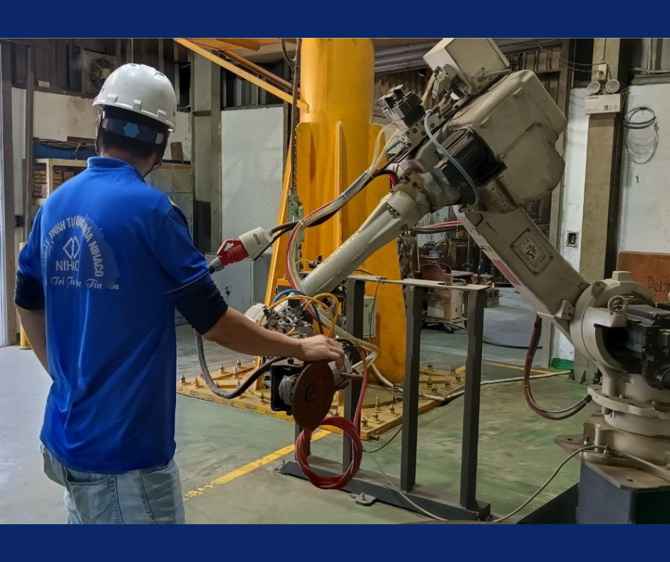 Nhân viên kỹ thuật Nihaco sửa chữa cánh tay robot cho máy mài
