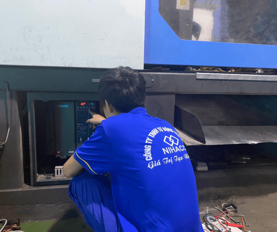 Nhân viên kỹ thuật Nihaco lắp đặt biến tần cho hệ thống máy đùn nhựa