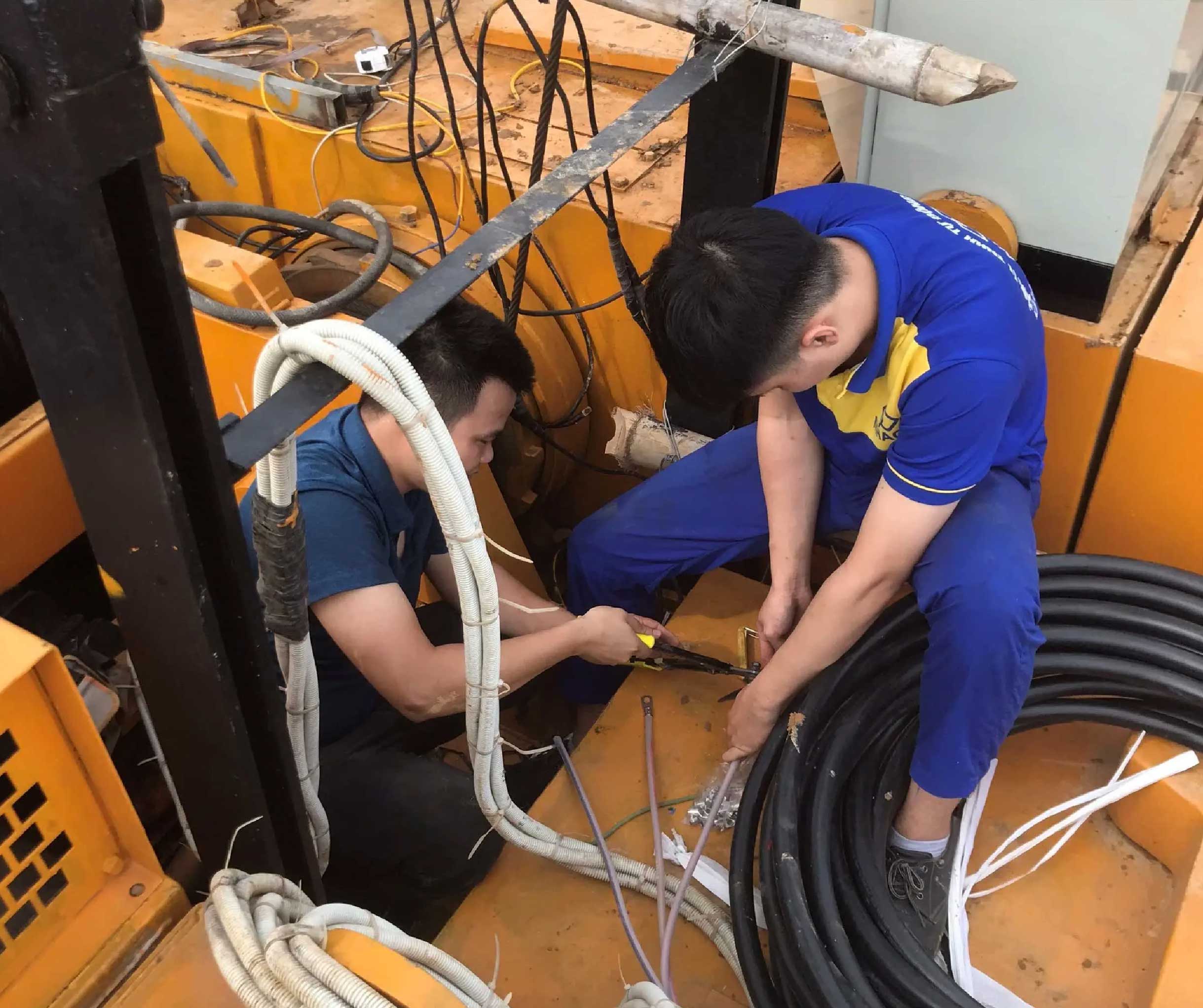 Đội ngũ kỹ thuật Nihaco nghiên cứu hướng đi dây và chuẩn bị đấu nối và lắp đặt biến tần cho máy xúc điện