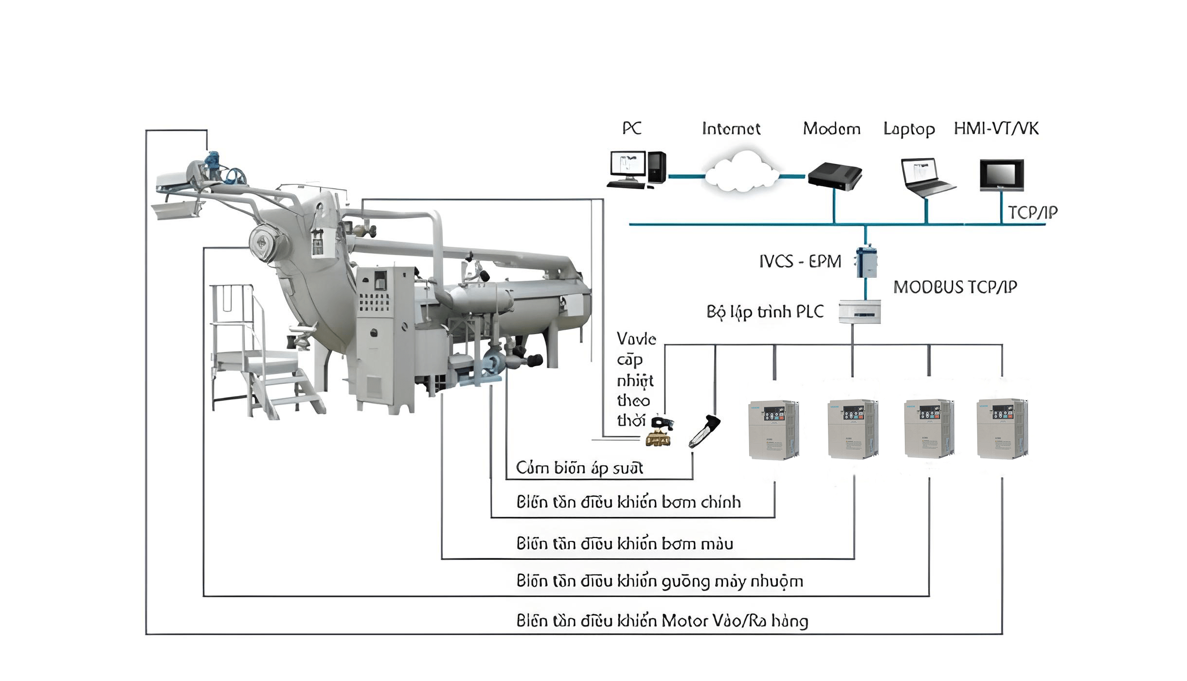 Mỗi 1 hệ thống nhuộm sử dụng 1 PLC làm bộ điều khiển trung tâm, điều khiển toàn bộ hệ thống máy nhuộm JET. Các bộ phận như bơm chính, guồng máy nhuộm đều được điều khiển bằng biến tần để dễ dàng cho việc thay đổi tốc độ, giảm sụt áp trên đường dây, bảo vệ cơ khí và motor. Bộ điều khiển trung tâm sẽ được kết nối đến internet, giúp cho người bảo trì dễ dàng chẩn đoán lỗi, debug chương trình từ xa mà không cần phải ở hiện trường. Tất cả các thiết bị (biến tần, PLC, HMI…) và khí cụ điện đều được tập trung vào phòng lạnh giúp thiết bị hoạt động ổn định hơn, tuối thọ được kéo dài hơn.