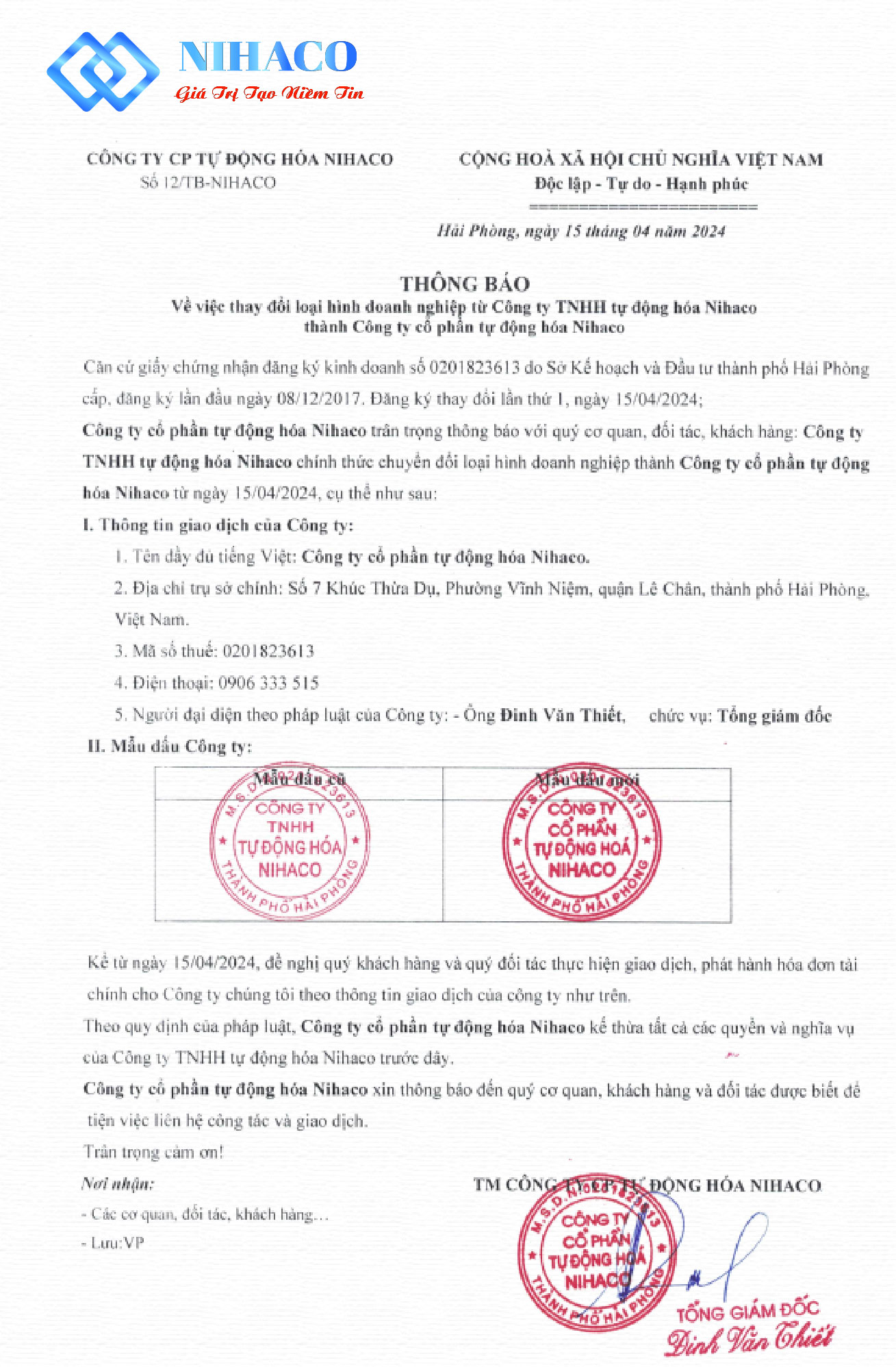 Công ty cổ phần tự động hoá Nihaco trân trọng thông báo với Quý khách hàng, Đối tác: Công ty TNHH tự động hoá Nihaco chính thức đổi loại hình doanh nghiệp thành Công ty cổ phần tự động hoá Nihaco từ ngày 15/04/2024 như công văn dưới đây.